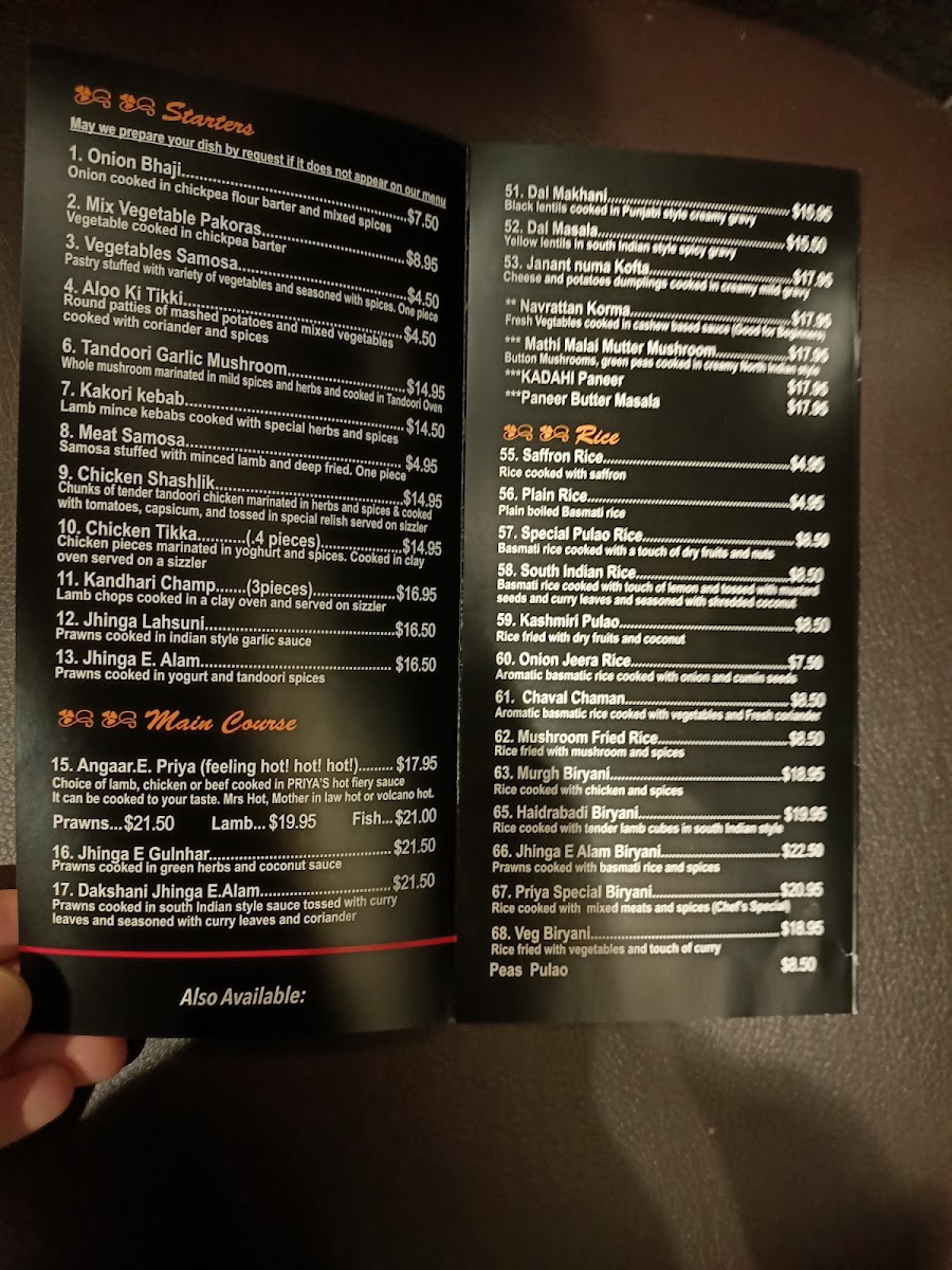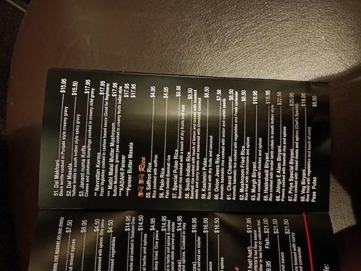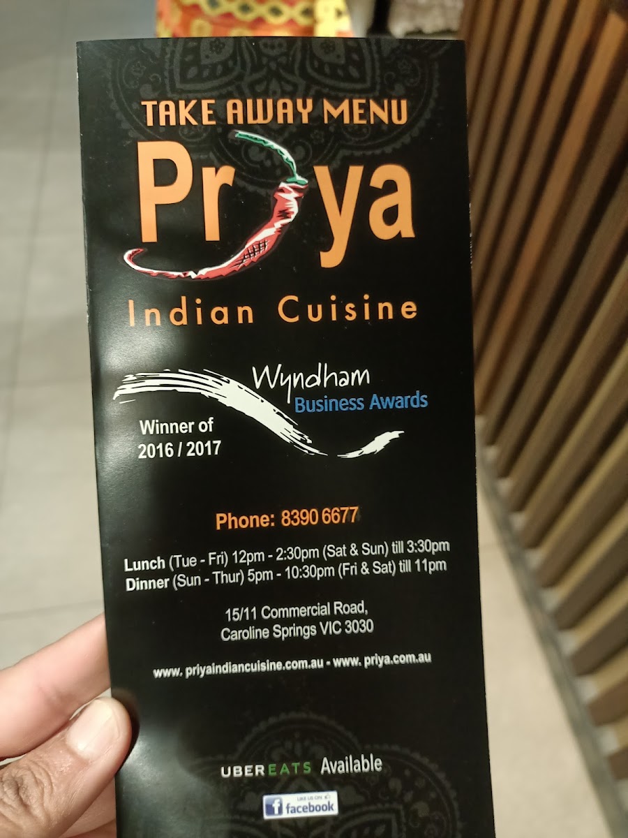 Welcome to Priya Indian Cuisine, a vibrant culinary gem nestled in the heart of Caroline Springs, Australia. This restaurant invites you to experience authentic Indian flavors through a diverse menu that beautifully balances tradition and innovation. Start your meal with Delhi Samosa Chaat, a fan favorite known for its delightful textures and rich spices. For a comforting main, don't miss the Saag Paneer or the succulent Beef Korma, both praised for their generous portions and robust flavors. The rice offerings, such as Kashmiri Pilao and Mushroom Fried Rice, perfectly complement any dish. Pair your meal with a refreshing Mango Lassi or an invigorating Lemonade. Customers rave about the warm ambiance, attentive service, and the passion of the staff, making Priya a must-visit destination for family gatherings or a casual dinner. Indulge in an unforgettable dining experience where every bite is infused with love and tradition!
